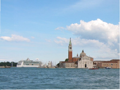 Nochmals die norwegische "Brilliance of the Seas" beim Verlassen von Venedig. Ein beeindruckendes Bild wenn ein solcher "Pott" durch Venedig fährt. Sie gehört zur Pan-Max-Klasse, also geht gerade noch durch den Panamakanal, Fast 300 m lang,