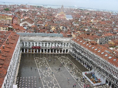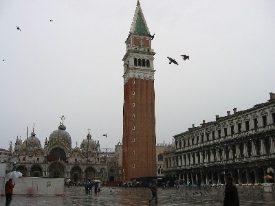 Der Campanile im Regen, da sieht man direkt den Platz, welcher an sonnigen Tagen von Strömen von Touristen übervölkert wird.