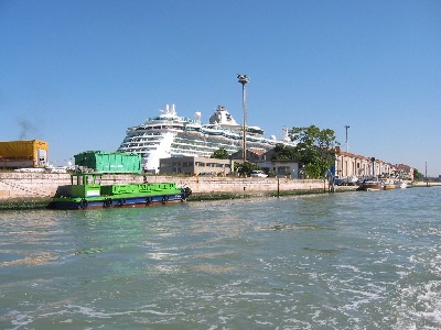 Richtig erstaunt waren wir als wir bei unserer Fahrt nach Murano hinter Lagerhäusern versteckt dieses mächtige Schiff entdeckten. Kaum zu glauben daß dieser Riese bis nach Venedig hereinfahren kann. Nach Rückkehr habe ich die Daten im Internet gefunden. Brilliance of the Seas einer norwegischen Reederei.